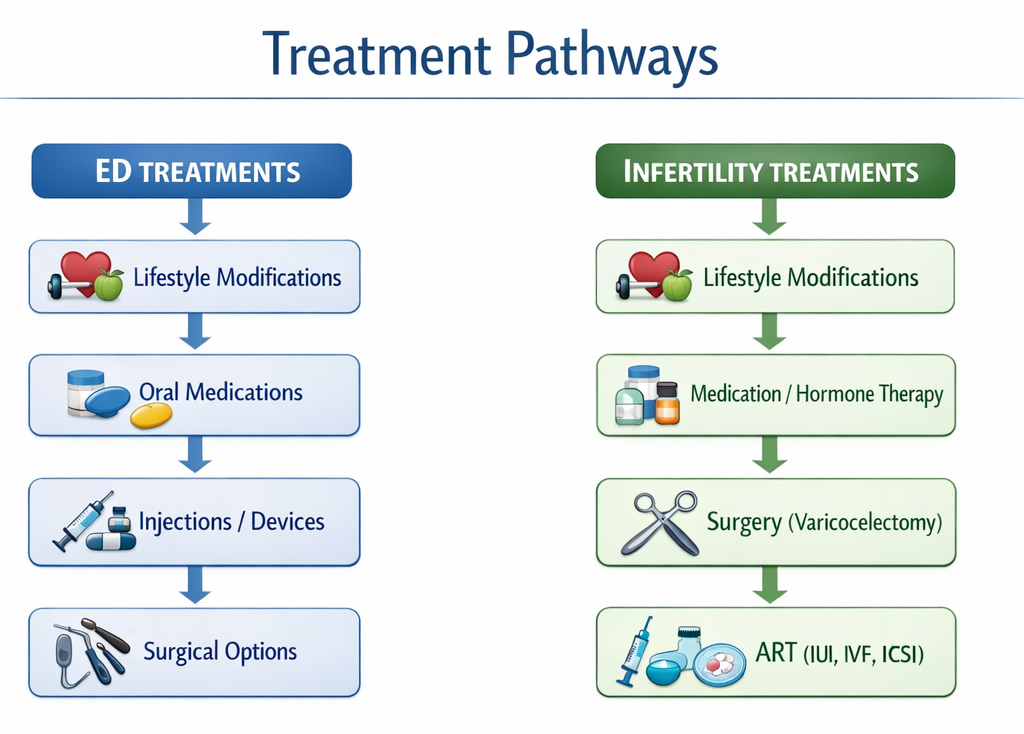 A man with infertility can have perfect erections. Everything works in the bedroom. But his sperm cannot do the job. That is a completely separate issue requiring different treatment.