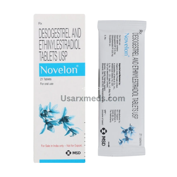 Novelon is a combined hormonal contraceptive containing Ethinyl Estradiol (estrogen) and Desogestrel (progestin) that prevents pregnancy by stopping ovulation and altering cervical mucus. Manufactured by Organon. One pack contains 21 active hormone tablets.